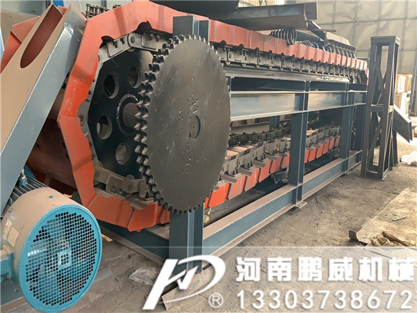 鏈板機(jī)結(jié)構(gòu)設(shè)計(jì)合理,使用性能好,運(yùn)行阻力小,易損零件少,操作安全,維修方便,運(yùn)行可靠,使用壽命長。鏈板機(jī)可水平或傾角<30°安裝,傾斜安裝時(shí),配有棘輪逆止機(jī)構(gòu)。輸送鏈板上的輥輪在導(dǎo)軌上滾動,輸送鏈與機(jī)殼無磨擦;鏈條采用合金鋼熱處理加工制成,其正常使用壽命3年左右,運(yùn)行中故障率低。除頭尾軸承外,輸送機(jī)中無潤滑點(diǎn)。鏈板機(jī)由頭部機(jī)架、頭部護(hù)罩、主動鏈輪組、輸料裝置、中部機(jī)架、尾部機(jī)架、改向鏈輪組,鏈板托輪組和驅(qū)動裝置組成。驅(qū)動裝置由柱銷聯(lián)軸器、JZQ減速機(jī)、驅(qū)動底座組成。分右裝和左裝兩種,從機(jī)尾向輸送方向看,驅(qū)動裝置在右側(cè)為右裝,在左側(cè)為左裝。鏈輪采用組裝式結(jié)構(gòu),由鑄鋼鏈輪圈與鏈輪芯用螺栓聯(lián)結(jié)組合,耐磨性能強(qiáng),便于拆卸安裝。主動鏈輪采用窩眼鏈輪圈,防止環(huán)鏈運(yùn)行中滑動。