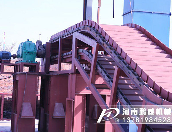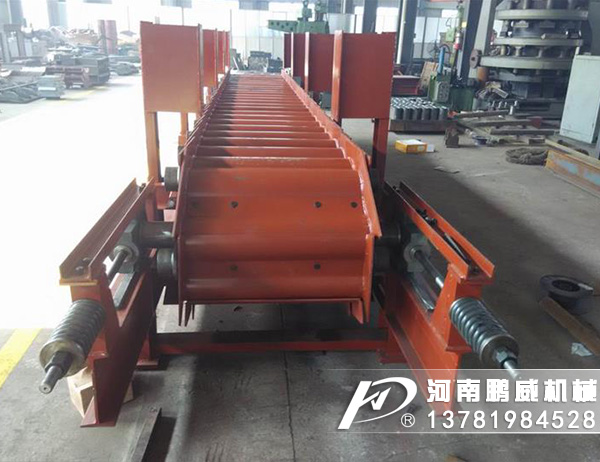 重型板式給料機是將電動機的動力,經(jīng)過聯(lián)軸器和減速器驅動鏈輪軸旋轉,通過鏈輪齒與鏈條銷軸嚙合,拖動鏈板作連續(xù)直線運動,鏈板由安裝在機架上的支重輪和鏈輪支承,并通過調整拉緊裝置使其鏈條與鏈輪正確嚙合,完成輸送給料之目的。