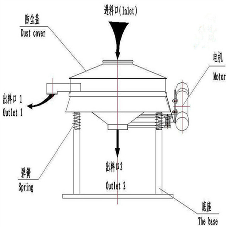 直排篩利用振動(dòng)電機(jī)利用其軸上下端的兩組偏心塊(不平衡偏心塊)的相位角以及兩臺(tái)電機(jī)之間的交叉角度將振動(dòng)電機(jī)的旋轉(zhuǎn)運(yùn)動(dòng)變?yōu)樗健⒋怪?、傾斜以及離心作用的多作用力重疊,再將這種作用力傳遞給篩面,從而達(dá)到篩分的目的。改變上下偏心塊的相位角和重量,可以改變激振力的大小和物料的運(yùn)動(dòng)軌跡。